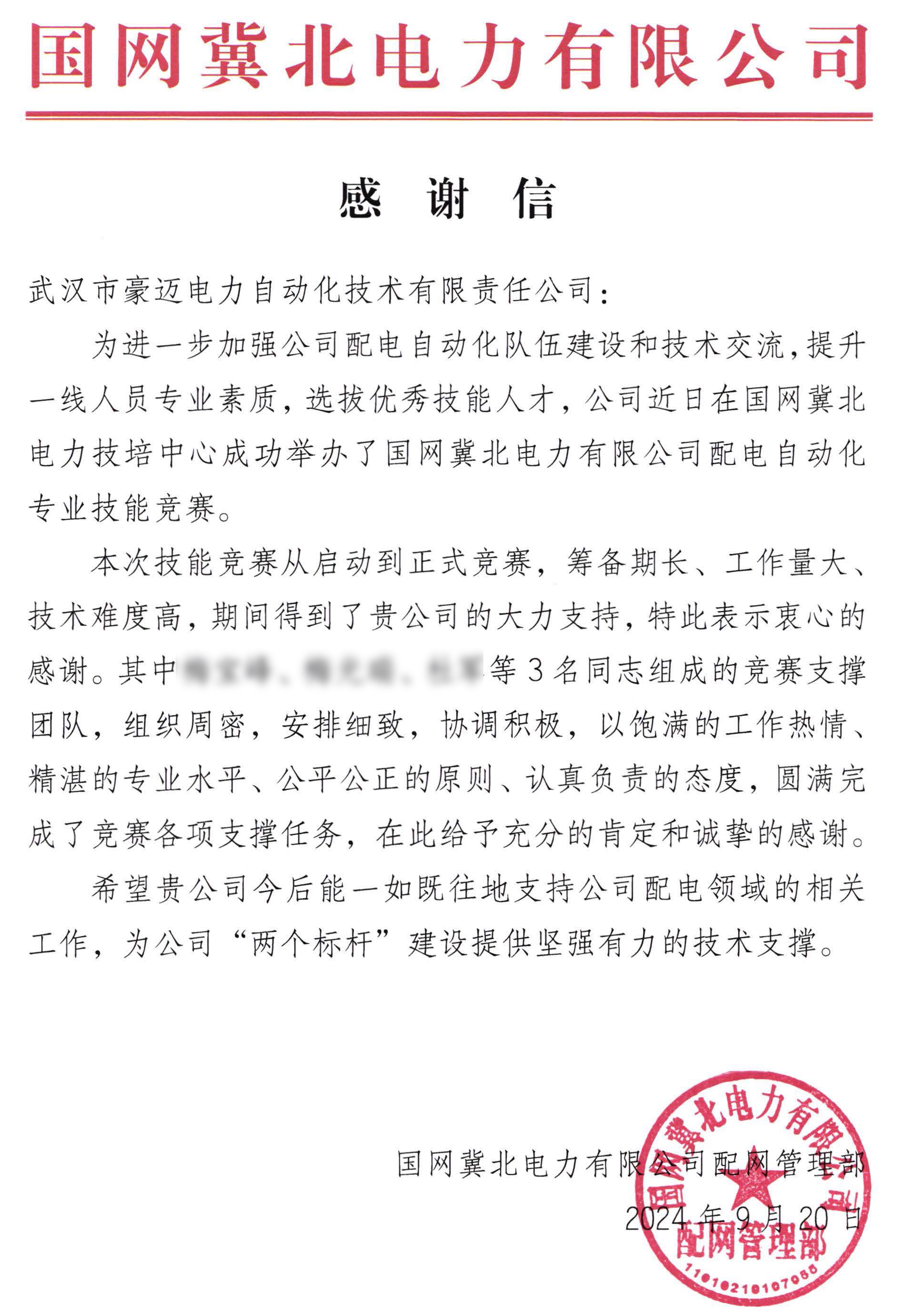 近日,武漢豪邁收到國網(wǎng)冀北電力發(fā)來的感謝信,信中對武漢豪邁安排員工“組成競賽支撐團隊,組織周密,安排細致,協(xié)調(diào)積極,以飽滿的工作熱情,精湛的專業(yè)水平、公平公正的原則、認真負責的態(tài)度,圓滿完成了競賽各項支撐任務(wù),給予充分的肯定和誠摯的感謝”。字里行間蘊藏著客戶對我司產(chǎn)品品質(zhì)、技術(shù)實力、服務(wù)能力的高度認可與滿滿信任,既是榮譽,也是鞭策,更是動力。