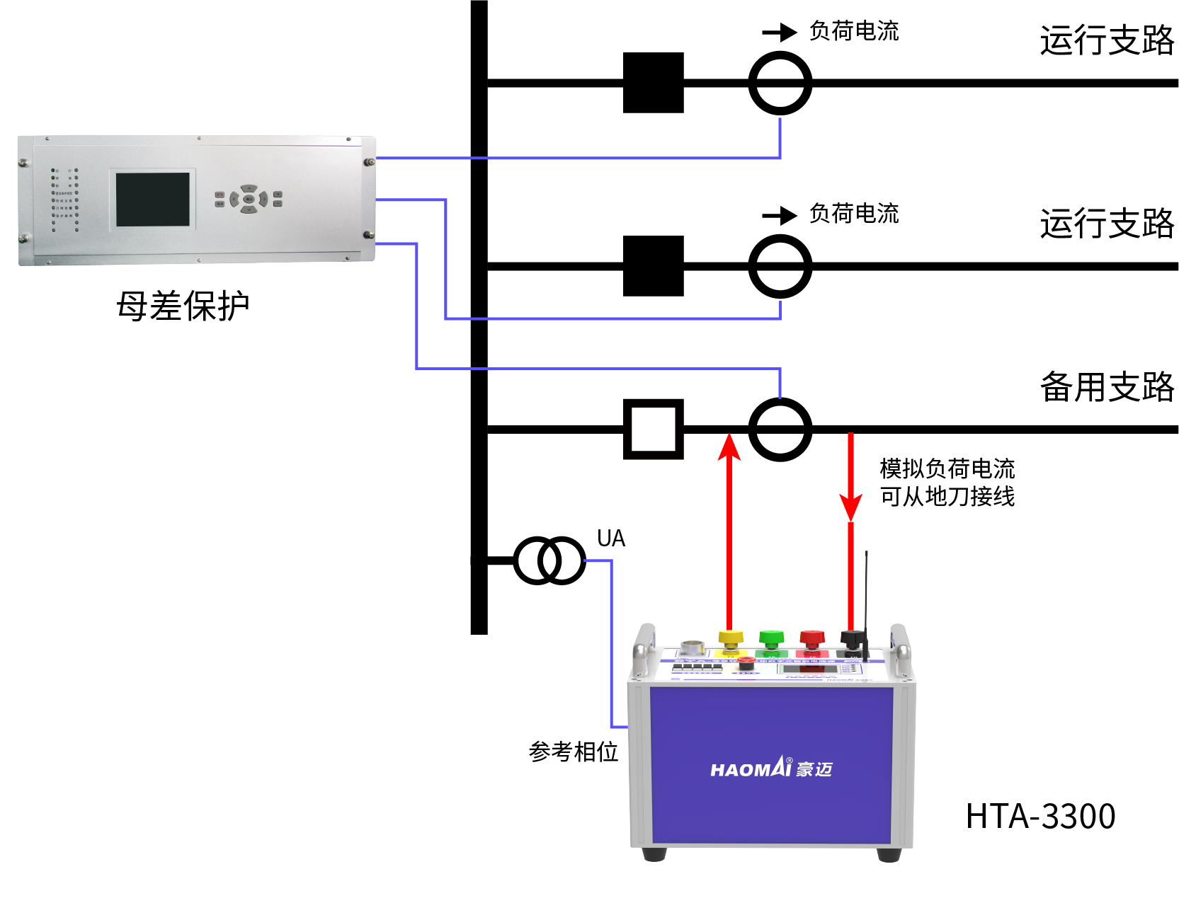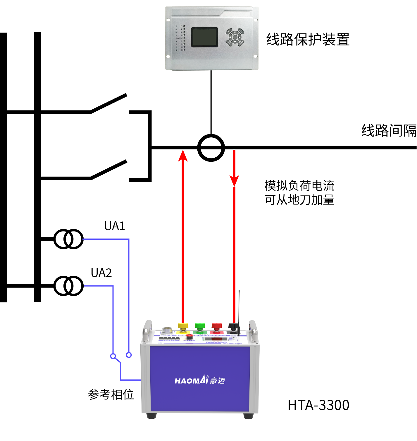 雙母線系統(tǒng)線路間隔停電更換保護,可以采用HTA-3300 三相數(shù)字式智能大電流源輸出0-300A電流加到CT一次側(cè),該電流分別與兩段母線PT的二次運行電壓UA1、UA2同步,模擬線路間隔分別接入兩段母線時的負(fù)荷電流,用于對該間隔的二次回路的向量檢查, 也可模擬輸出零序電流用于檢查N線。