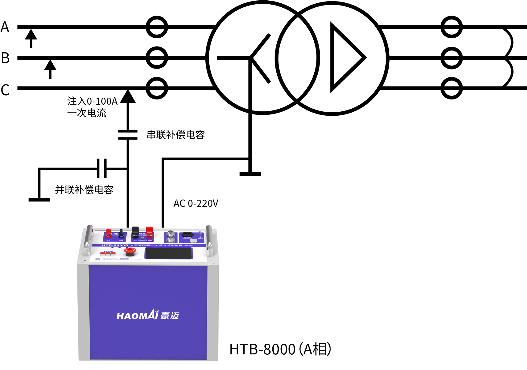 HTB-8000 通過串聯(lián)電容補償來抵消變壓器的激磁感抗,采用380V/220V電源從變壓器中壓(或高壓)Y側(cè)一次繞組(CT外側(cè))注入100A電流,其他側(cè)分別短接(CT外側(cè)),變壓器各側(cè)一次繞組均有電流流過CT,CT二次回路所產(chǎn)生的電流即可用于對變壓器保護進行向量檢查。