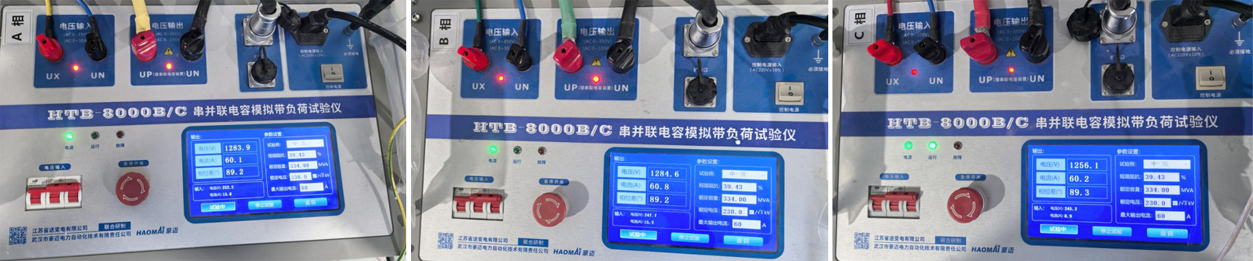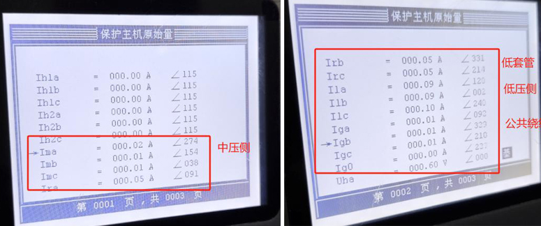 本次使用HTB-8000 大型變壓器一次通流試驗(yàn)裝置對(duì)500kV主變差動(dòng)保護(hù)進(jìn)行向量檢查,從一次側(cè)升壓,利用變壓器本身短路阻抗實(shí)現(xiàn)穿越通流,一次性實(shí)現(xiàn)對(duì)主變高(中)壓側(cè)外附CT、套管CT、公共繞組CT以及低壓側(cè)外附CT、套管CT通流,驗(yàn)證主變縱差保護(hù)、分相差動(dòng)保護(hù)、分側(cè)差動(dòng)保護(hù)以及低壓側(cè)小區(qū)差動(dòng)保護(hù)向量正確性,通過差流大小即可判斷主變保護(hù)向量極性是否正確,大大提高送電效率。