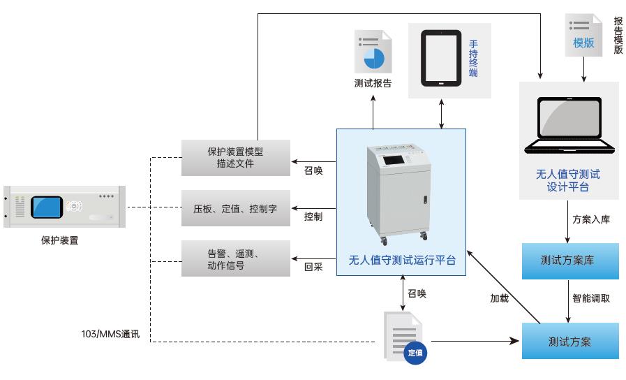 電廠繼電保護(hù)自動測試平臺 建立標(biāo)準(zhǔn)化測試流程庫,配置高精度功放輸出,搭配航插接口,可實現(xiàn)保護(hù)裝置一鍵閉環(huán)測試。 測試過程不換線,無人化值守,自動生成定制化模板報告,測試時間從原來的一周左右縮短至8小時,測試用例覆蓋率提升至98%以上,運(yùn)用閉環(huán)測試技術(shù)實現(xiàn)毫秒級動作特性校驗。 該創(chuàng)新模式的全面應(yīng)用,實現(xiàn)保護(hù)裝置定期檢驗由經(jīng)驗驅(qū)動到數(shù)據(jù)驅(qū)動的轉(zhuǎn)變,測試效率較傳統(tǒng)方式提升5-8倍。