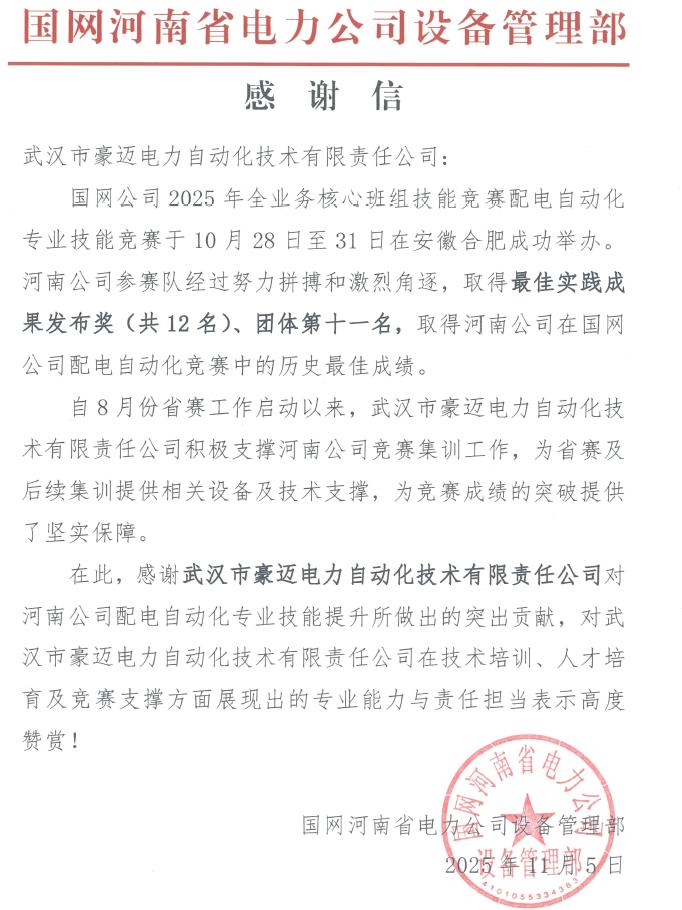 近日,武漢豪邁接連收到國(guó)網(wǎng)河南省電力、國(guó)網(wǎng)北京市電力發(fā)來(lái)的感謝信,信中高度肯定并感謝我司對(duì)國(guó)網(wǎng)公司2025年全業(yè)務(wù)核心班組技能競(jìng)賽配電自動(dòng)化專(zhuān)業(yè)技能競(jìng)賽集訓(xùn)工作的積極支撐??蛻?hù)在信中表示,武漢豪邁為選拔考試及集訓(xùn)提供相關(guān)設(shè)備及技術(shù)支撐,為競(jìng)賽成績(jī)的突破提供了堅(jiān)實(shí)保障,并對(duì)公司在技術(shù)培訓(xùn)、人才培育及競(jìng)賽支撐方面展現(xiàn)出的專(zhuān)業(yè)能力與責(zé)任擔(dān)當(dāng)表示高度贊賞。