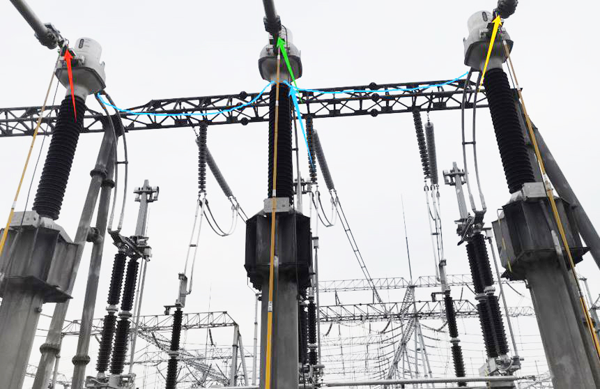 由于兩站都采用 AIS 架空接線,變電站側(cè)試驗使用一臺三相電流源在 2212 間隔 CT 進行一次升流,將試驗設(shè)備三相輸出線分別夾在三相電流互感器 P1 位置注流,過電流互感器之后使用一次三相短接線短接接入至通流設(shè)備的 N 實現(xiàn)回流(若條件允許可通過地刀回流),盡可能減少通流路徑范圍從而規(guī)避對運行系統(tǒng)的影響。風電場側(cè)試驗使用一臺三相電流源在 2211 間隔 CT 進行一次升流,直接將試驗儀器三相輸出線分別夾在三相電流互感器 P1 位置注流,過電流互感器后使用一次三相短接線短接接入至通流設(shè)備的 N 實現(xiàn)回流,盡可能減少通流路徑范圍以規(guī)避對運行系統(tǒng)的影響。