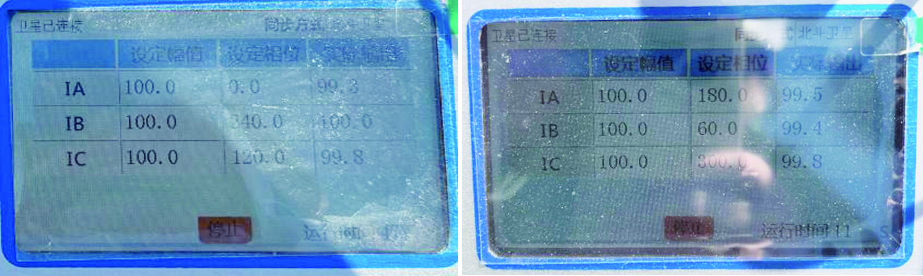 試驗設(shè)備開機后,選擇 GPS 對時方式,兩站之間可通過 GPS 同步對時。對上時后按照變電站側(cè)電流源一次施加電流 A 相 100A ∠ 0 °, B 相 100A ∠ 240 °, C 相 100A ∠ 120 °,風電場側(cè)電流源一次施加電流 A 相 100A ∠ 180 °, B 相 100A ∠ 60 °, C 相 100A ∠ 300 °分別輸出,通過 秒脈沖同步觸發(fā),保證過零時刻兩邊電流輸出相位同步。 在保護裝置 查看采樣和差流,完成線路差動保護向量校核試驗。