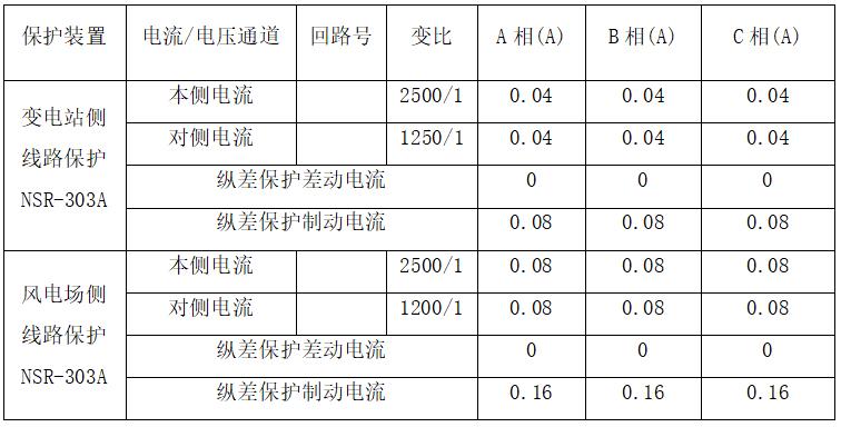 變電站側(cè)實際通流方向為母線流向線路,風電場側(cè)實際通流方向也為母線流向線路,保護裝置顯示電流均為折算后電流,差動電流為 0 ,說明線路差動保護向量正確。